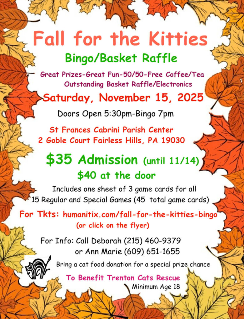 Welcome to Trenton Cats Rescue Adoption Events 📆 🐈⬛ Every Saturday and Sunday 12p–3p at PetSmart in Fairless Hills, PA.LOCATION Community 🫶 Spay and neuter assistance available. INFO News 📢 Fall For The Kitties BINGO – Saturday, November 15.TICKETSEVENTS See Cats in Person 👀🐈⬛ Visit some of our kitties that stay in the adoption center at PetSmart in Fairless Hills, PA. ROSTER